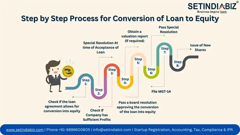 In order for a loan to be converted into equity, the company must have passed a special resolution at the time of accepting the loan, which specifies that the loan may be converted into equity in the future. This is necessary to ensure that the lender is aware of the possibility of the loan being converted into equity, and that they have agreed to this possibility. The special resolution should specify the following: